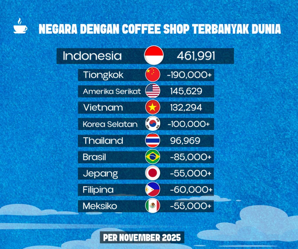 12 Januari 2025 – Indonesia kembali mencatatkan prestasi di industri kopi dunia. Berdasarkan database global Point of Interest (POI) yang memetakan lokasi cafe dan coffee shop melalui OpenStreetMap, Indonesia tercatat sebagai negara dengan jumlah coffee shop terbanyak di dunia per November 2025. Totalnya mencapai 461.991 titik lokasi, mengungguli negara-negara lain seperti China, Amerika Serikat, Australia, hingga Brasil.