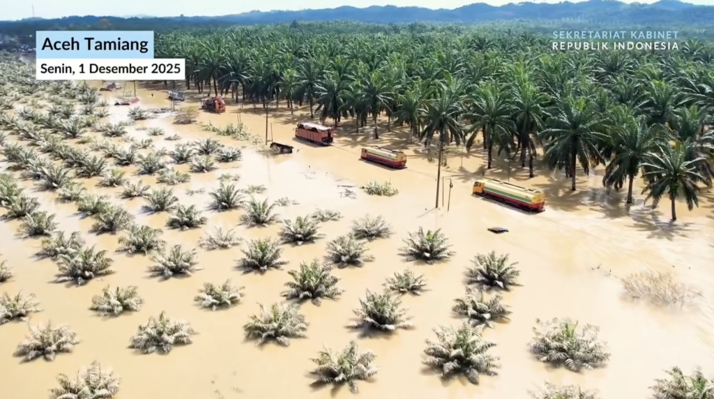 Rekaman udara memperlihatkan truk BBM, truk logistik, hingga kendaraan berat lainnya antre pada jalur yang masih tergenang banjir, menggambarkan tingginya tantangan distribusi bantuan di kawasan tersebut.