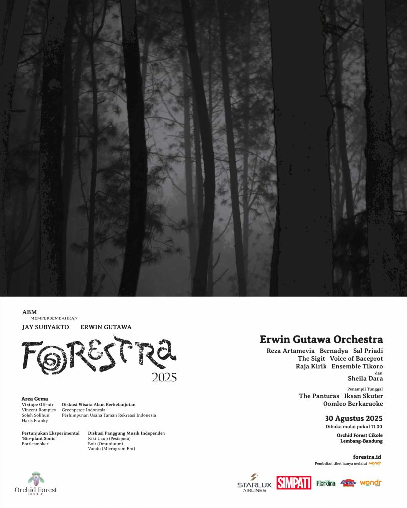Forestra 2025 akan berlangsung pada 30 Agustus 2025 di Orchid Forest Cikole, Lembang – Bandung. Keindahan alam hutan pinus yang menjadi lokasi penyelenggaraan akan menghadirkan pengalaman musik yang berbeda dan tak terlupakan.
